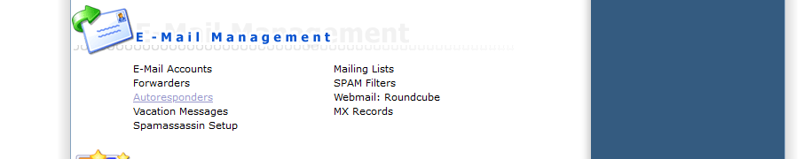 Na inloggen in uw direct admin acount, vind u onder E-mail management twee opties: Autoresponders en Vacation Messages.