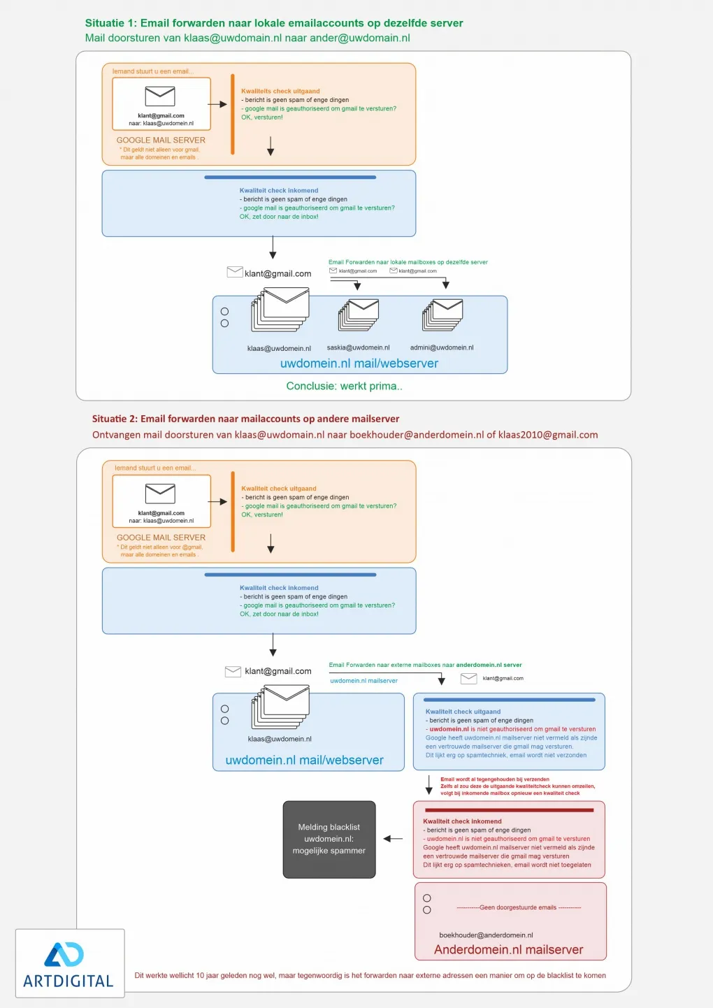 Hoewel dit een werkwijze is die wellicht 10 jaar geleden nog vrij vaak toegepast werd, kan dit tegen woordig niet meer. Hieronder hebben we een vereenvoudigd schema gemaakt hoe de email en filtering verloopt, die hopelijk duidelijker maakt waarom dit zo lastig is.