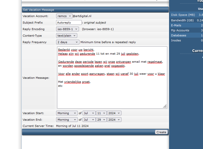 Wanneer u op binnenkomende emails een automatisch antwoord wilt terug sturen, kunt u dat in stellen in het webhosting paneel Direct Admin.