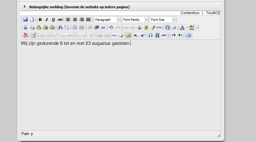 Indien dit veld is ingevuld, en de pagina bewaard is, verschijnt de melding boven in op de publieke website, en verdwijnt als alle content weer verwijderd is uit dit veld.