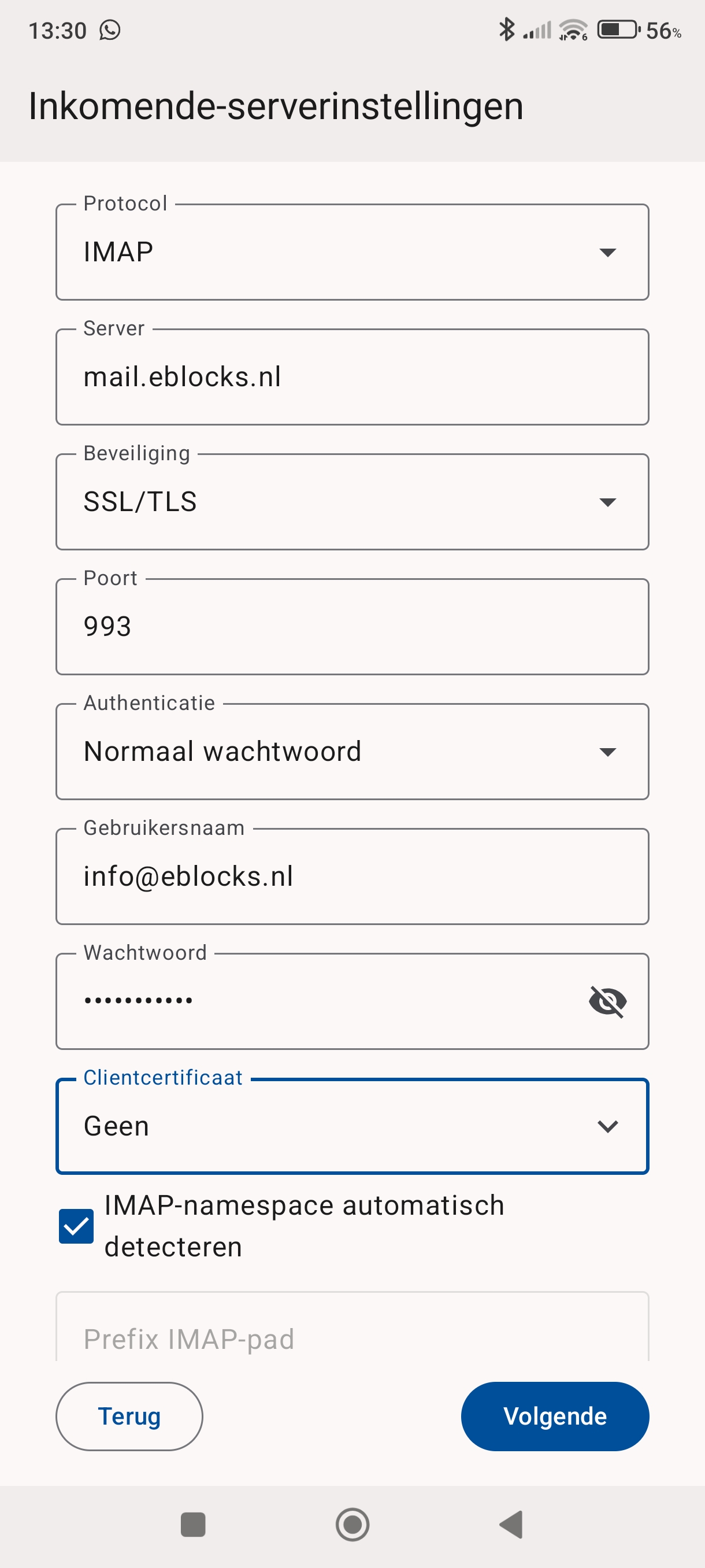 Server voor inkomende email: mail.uwdomein.nl (Poort 465 SSL/TLS)